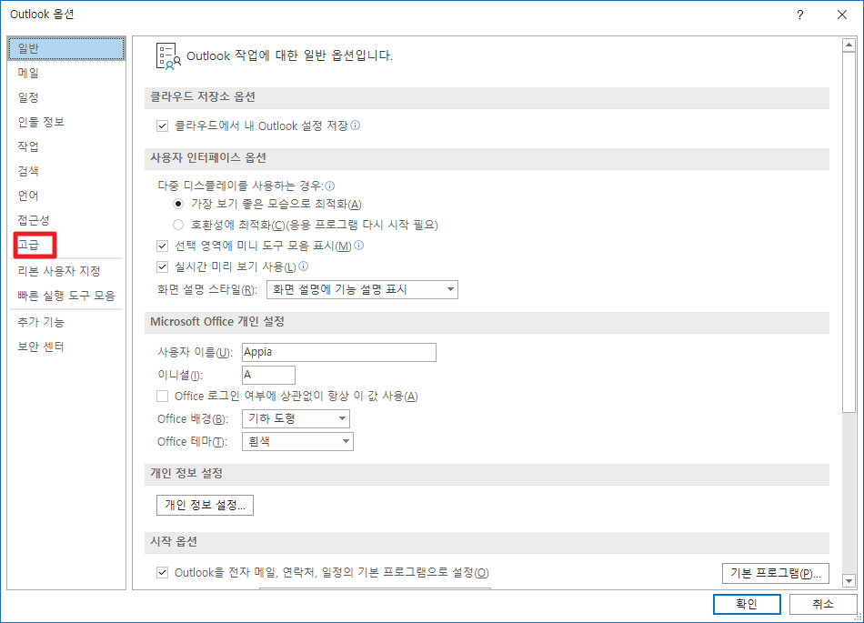 옵션 메뉴에서 좌측에 보이시는 [고급]탭을 클릭하여 주시길 바랍니다.