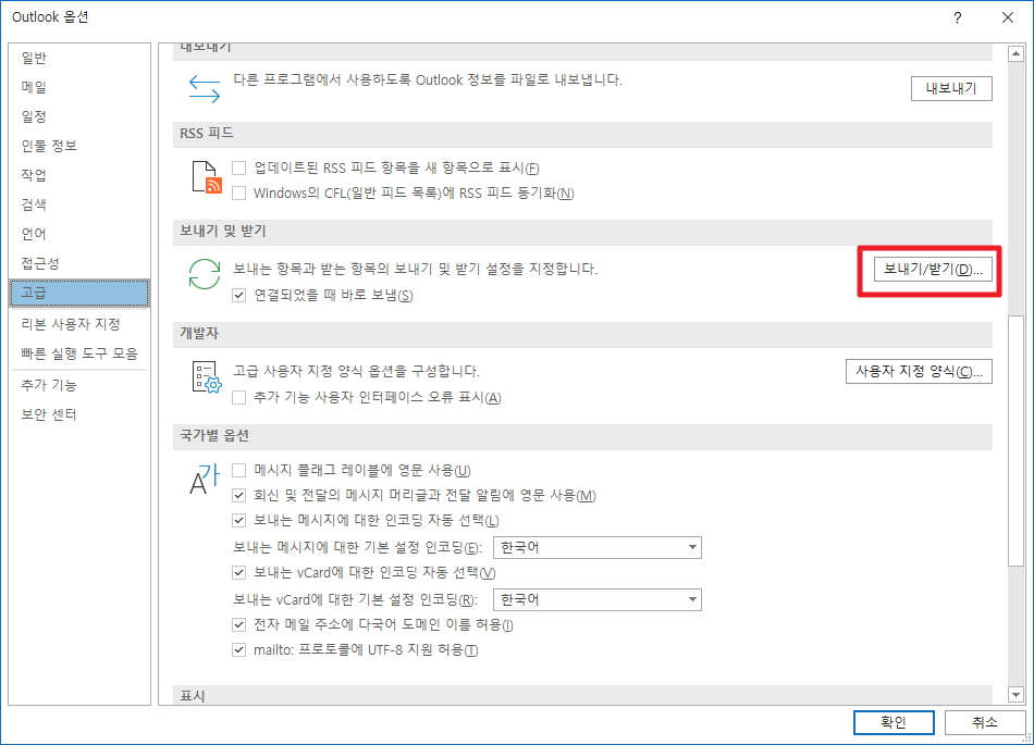 그럼 다음과 같은 고급 메뉴가 나타나는 데, 여기에서 드래그 다운을 하셔서 [보내기 및 받기] 부분을 확인해주시길 바랍니다. 그런 후에 보이시는 바와 같이 [보내기/받기]부분을 클릭하여 주시길 바랍니다.