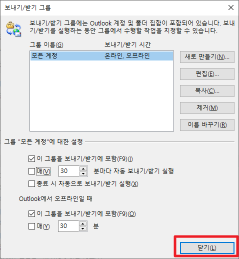 이와 같은 방법으로 메일을 특정 시간마다 자동으로 송수신 하는 설정을 해제 할 수 있습니다.