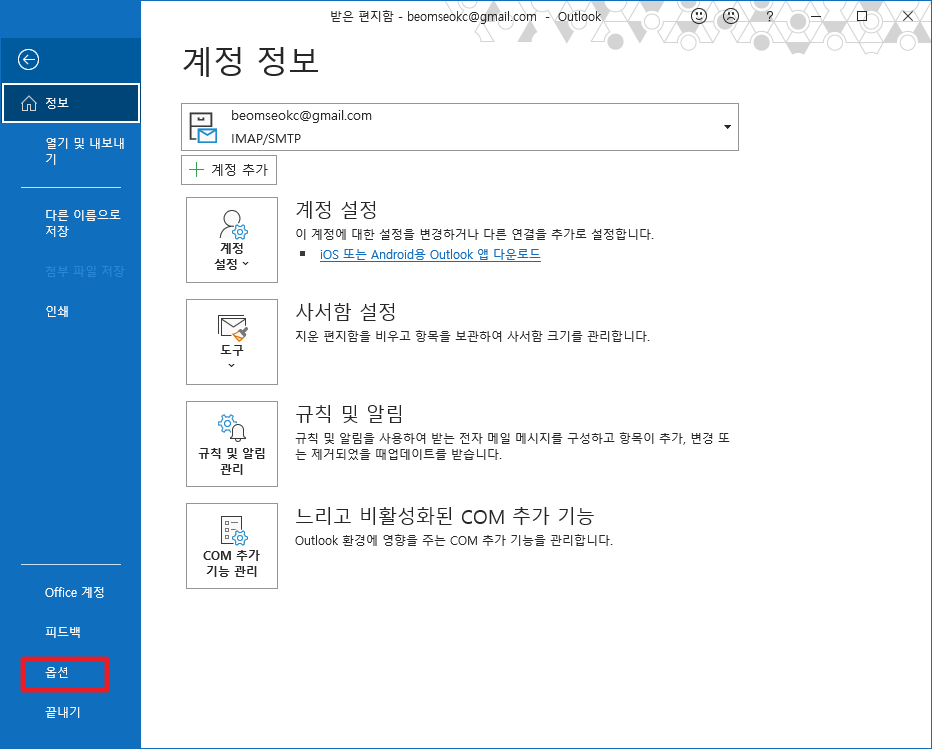 그럼 다음과 같은 화면이 나타날 것입니다. 여기에서 좌측 하단에 있는 [옵션]부분을 클릭하여 주시길 바랍니다.