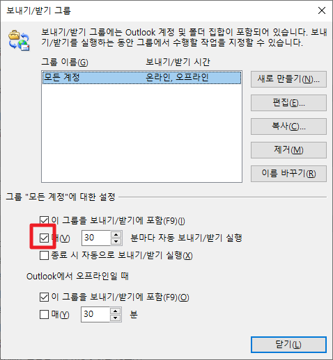 그럼 다음과 같은 화면이 나타날 것입니다. 여기에서 빨간색 부분과 같이 [매 30분 마다 자동 보내기 /받기 실행]부분 앞의 체크박스를 해제 하여 주시길 바랍니다.