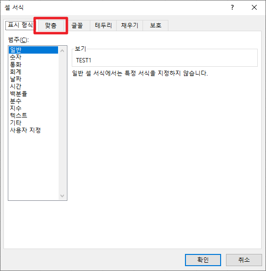 그럼 다음과 같은 셀 서식이 나타납니다. 대부분 초기 설정으로 [표시형식]이 나타납니다. 여기에서 상단에 있는 [맞춤]부분을 클릭하여 주시길 바랍니다.