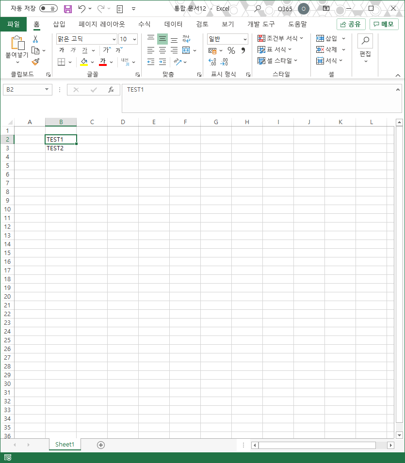 먼저, 다음 B2, B3의 각 텍스트를 "TEST1", "TEST2"라고 입력하였습니다. 먼저, B2를 선택하시고, 오른쪽 버튼을 클릭하여 주시길 바랍니다.