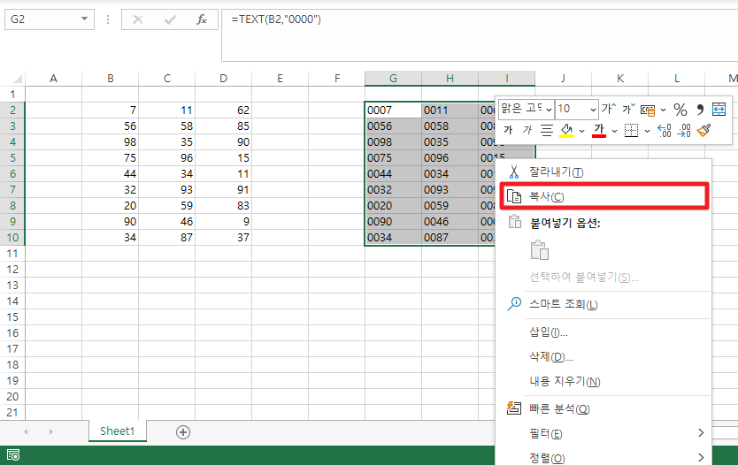 먼저, 함수의 결과중에 일반값으로 변경하고자 하는 부분에 대해서 선택하시고 복사(Ctrl + C)또는 마우스 오른쪽 버튼을 눌려주시길 바랍니다. 그런 후에 다음 화면에서와 같이 [복사]부분을 클릭하여 주시길 바랍니다.