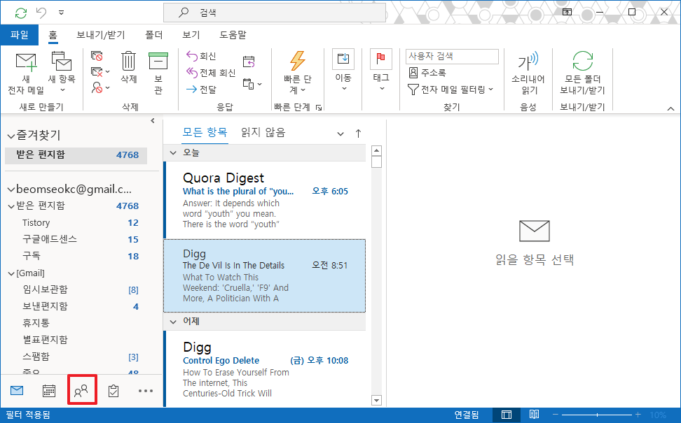 먼저, 아웃룩(Outlook)을 실행하면, 다음과 같은 화면이 나타납니다. 여기에서 좌측 하단에 있는 연락처 부분의 아이콘을 클릭하시길 바랍니다.