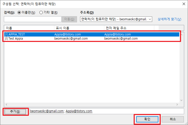 그럼 여기에서 등록되어 있는 메일들이 나타납니다. 그룹으로 묶으길 원하는 메일 주소를 하나씩 선택하고, 추가 버튼을 눌러서, 그룹을 구성하시길 바랍니다. 그런 후에 [확인]부분을 클릭하여 주시길 바랍니다.