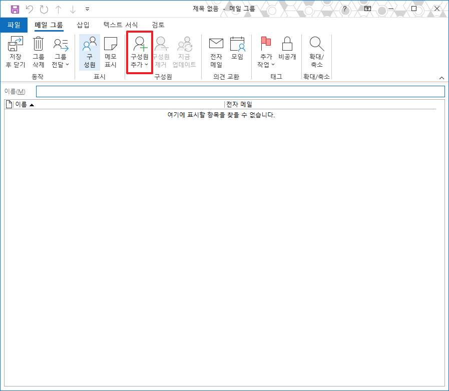 위에서 메일 그룹부분을 클릭하시면 다음과 같은 화면이 타납니다. 여기에서 [구성원 추가]부분을 클릭하여 주시길 바랍니다.