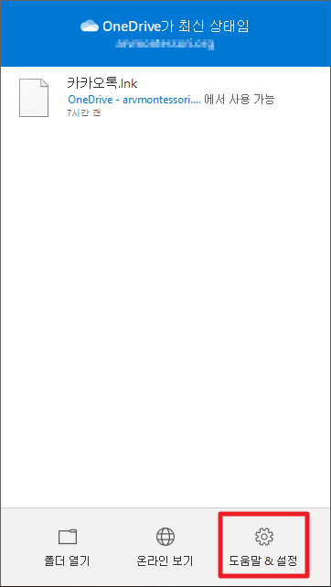 그럼, 다음과 같이 원드라이브(OneDrive)를 실행하시면 다음과 같은 화면이 나타납니다. 여기에서 하단 우측에 있는 [도움말&설정]부분을 클릭하여 주시길 바랍니다.