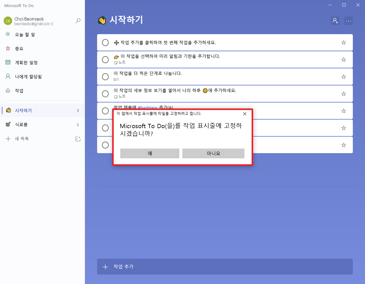위에서 [시작]부분을 클릭하셨다면, Microsoft To Do가 실행이 될 것입니다. 여기에서 작업 표시줄에 고정할 것인지에 대해서 선택을 할 수 있습니다.