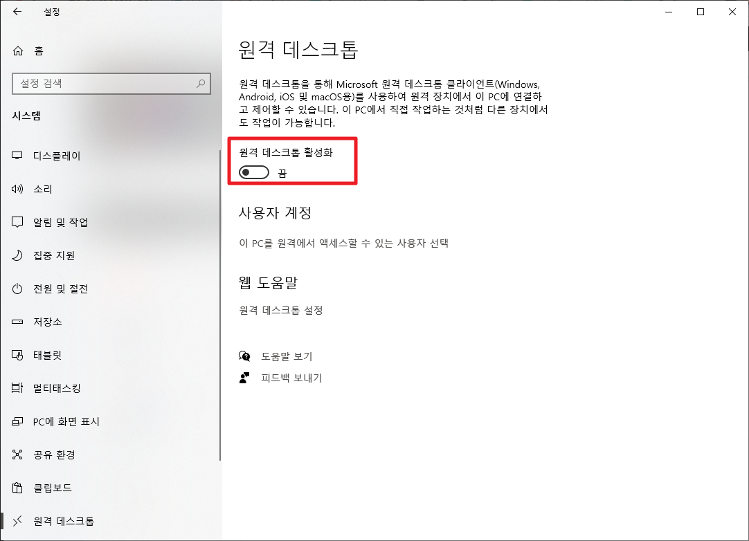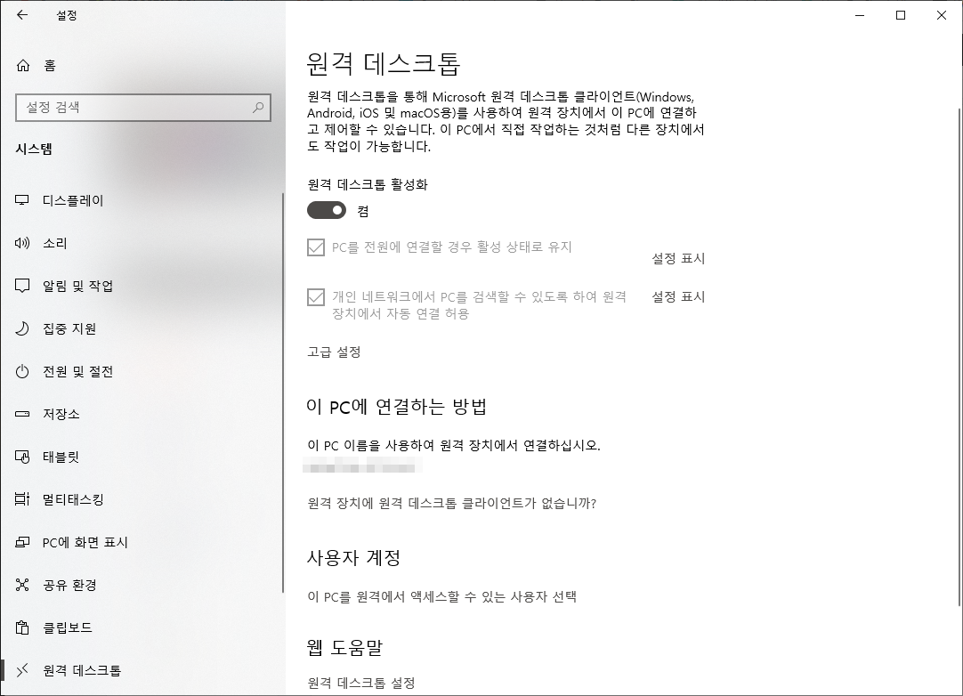 그럼 다음과 같은 화면이 나타날 것입니다. 여기에서 [원격 데스크톱 활성화]부분을 켬으로 변경하여 주시면 됩니다.