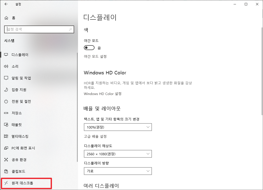 위에서 [시스템]부분을 클릭하신다면 다음과 같은 화면이 나타날 것입니다. 여기에서 좌측 하단에 있는 [원격 데스크톱]부분을 클릭하여 주시길 바랍니다.