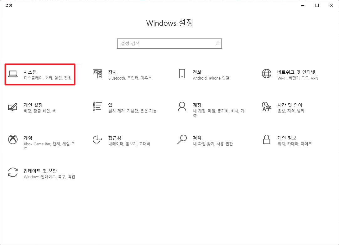 위에서 [설정]메뉴를 누르셨다면 다음과 같은 화면이 나타납니다. 여기에서 [시스템]부분을 클릭하여 주시길 바랍니다.