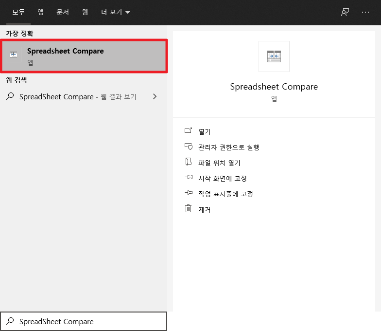 먼저, 시작 키를 입력하시고, [Spreadsheet Compare]을 입력해 주시길 바랍니다. 그럼 다음과 같은 화면이 나타날 것입니다. 그런 후에 다음 그림에서와 같이 Spreadsheet Compare을 클릭하여 실행해 주시길 바랍니다.