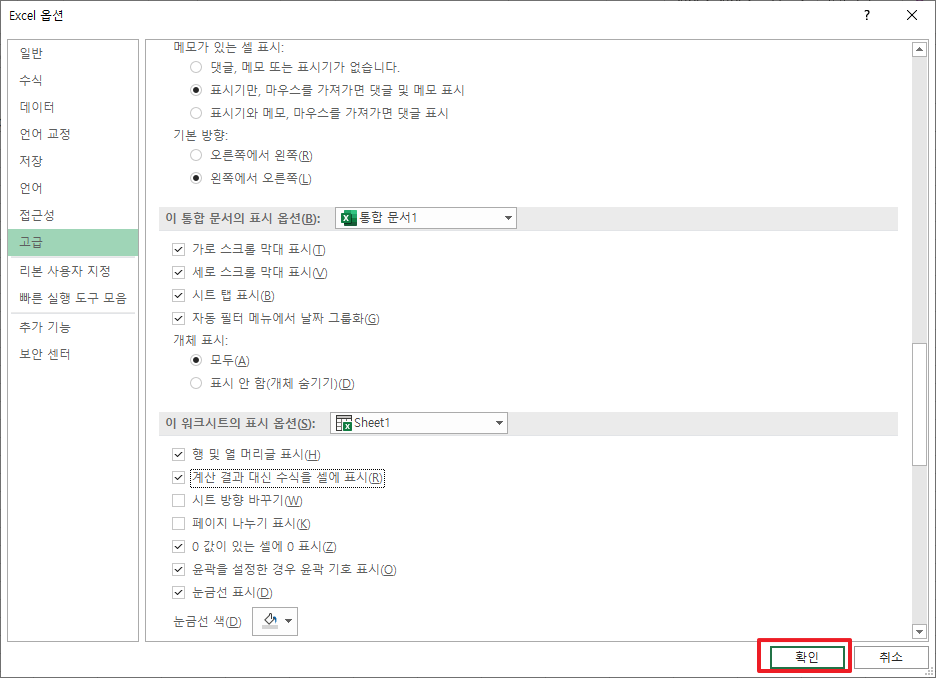 위에서 [고급]메뉴를 클릭하면 다음과 같은 화면이 나타날 것입니다. 여기에서 스크롤 다운을 하시다보면 다음과 같은 홤녀이 나타날 것입니다. 여기에서 [계산 결과 대신 수식을 셀에 표시]부분을 체크 해주시길 바랍니다.