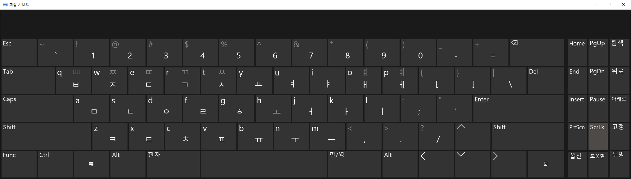 물론, 단축키 또한 제공을 하고 있습니다. [Windows키 Ctrl + O] 키를 눌려 주시면 자동으로 실행이 됩니다. 화상 키보드를 실행하시면 다음과 같은 화면이 모니터에 나타날 것입니다. 각 부분을 클릭하셔서 사용하시면 됩니다.