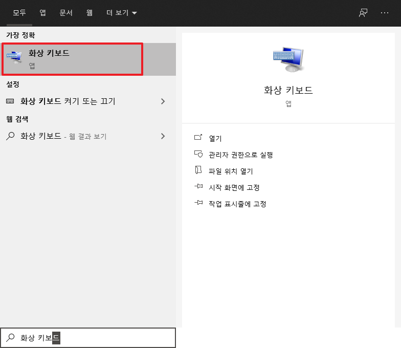 물론, 키보드가 있고, 특정 버튼이 없어서 화상 키보드를 사용하시는 것라면 다음과 같이 [화상 키보드]를 타이핑 하셔서 검색하여 실행하셔도 됩니다.
