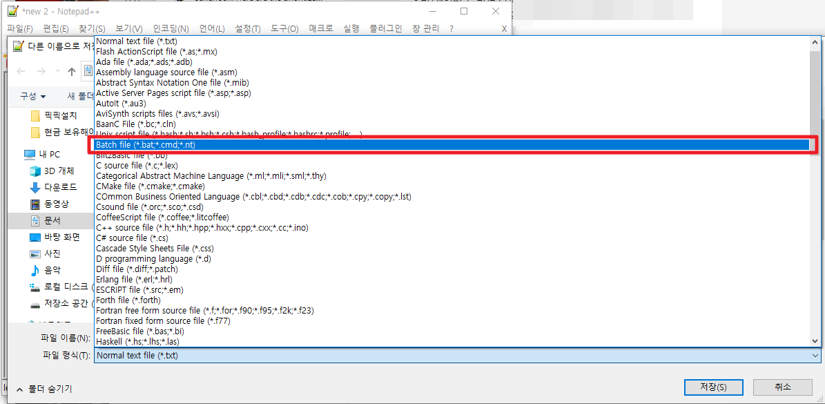 그럼 별도의 다이얼로그가 열린 것입니다. 여기에서 하단에 있는 파일 형식 부분을 클릭하시면 다양한 메뉴가 나타날 것입니다. 여기에서 [Batch file(*.bat, *.cmd, *.nt)]부분을 선택해 주시길 바랍니다.