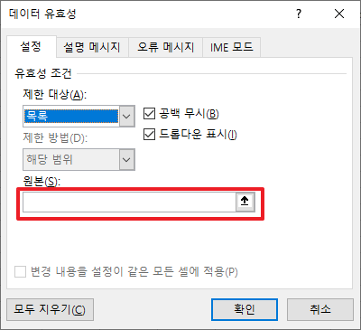 그럼 다음과 같이 관련된 셀을 선택할 수 있는 부분(원본)이 나타납니다. 빨간색 부분을 한번 클릭하여 주시길 바랍니다.