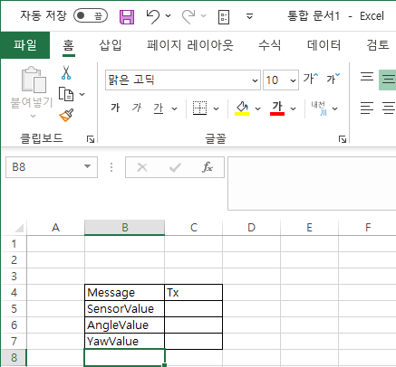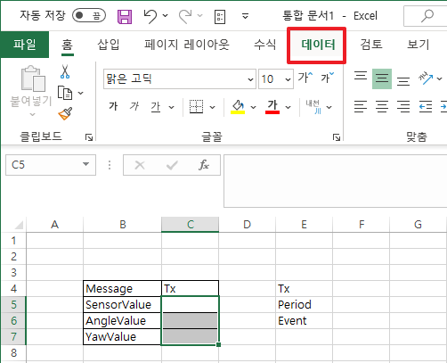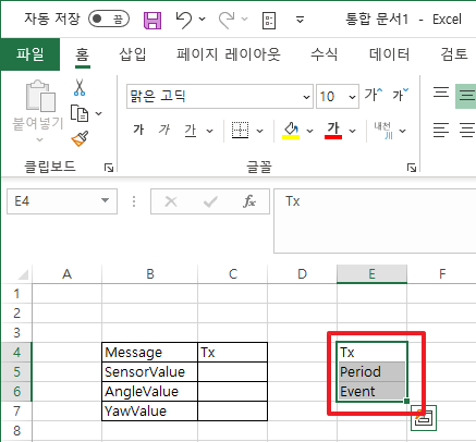 먼저, 다음과 같은 데이터가 있습니다. 실은 메시지의 송신 타입에 대해서 정하기 위해서 다음과 같은 데이터를 입력하였습니다. 여기에서 Tx 부분에 대해서 주기적으로 움직일지, 아니면 이벤트 성으로 움직 일지에 대해서 입력하는 셀입니다.
