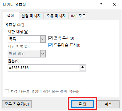 그럼 다음과 같은 데이터 입력이 된 부분에 대해서 나타날 것입니다. 여기에서 [확인] 부분을 클릭하여 주시길 바랍니다. 여기서 주의해야 할 점은 바로 [드롭다운 표시] 부분이 반드시 체크되어 있어야 합니다. 그렇지 않으면, 정해진 값에 대해서 직접 입력해주셔야 합니다. 만약 그 항목에 없는 값이면 에러 표시가 나타납니다.
