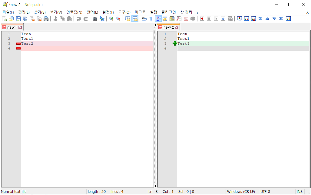 이와 같은 방식으로 노트패드++(NotePad++)를 이용하여 텍스트를 비교할 수 있습니다.
