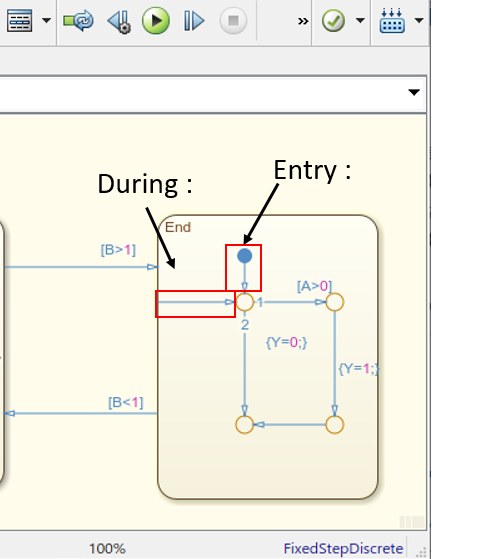 먼저, State안의 Flowchart입니다. 아시다시피, 앞서서 설명했던 Flowchart와 모두 동일합니다. 단, State의 안의 Default Transition이 State의 Entry에 해당하는 키워드입니다. 그리고 벽면에서 Junction에 연결되는 Transition이 바로 During을 의미합니다.