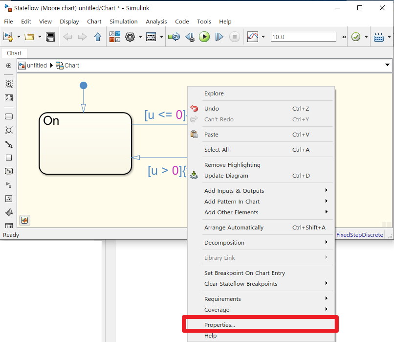 위와 같이 Mealy, Moore Chart을 선택은 설정에서 미리 지정을 할 수 있습니다. 먼저 Stateflow 화면에서 우측 버튼을 눌러 주세요. 여기에서 [Properties...]를 클릭해 주세요.
