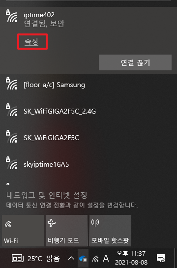 위에서 연결 부분을 클릭하시면 다음과 같이 연결된 정보에 대해서 표시를 하게 됩니다. 그중에서 현재 연결된 부분에서 [속성]부분을 클릭하여 주시길 바랍니다.