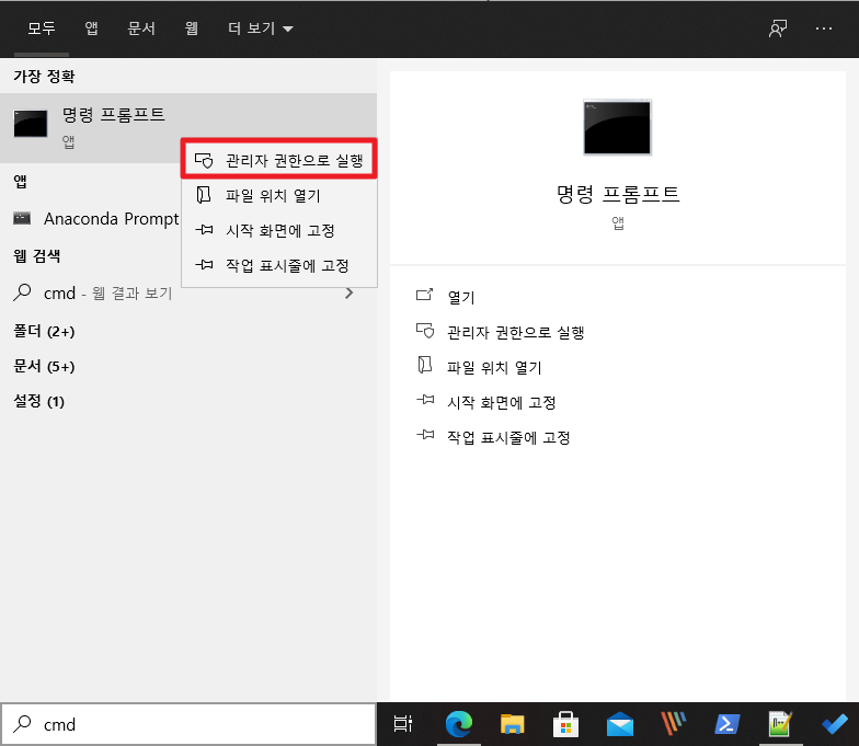 [윈도우10 Windows10] 관리자 권한으로 명령 프롬프트(CMD) 실행하기