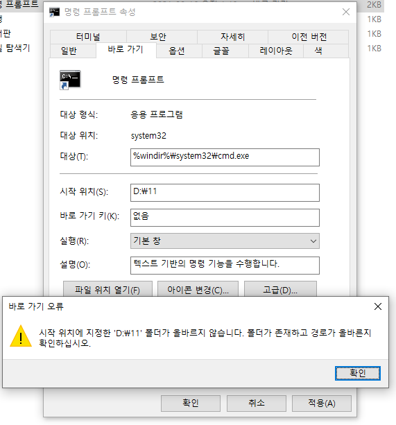 그럼 다음과 같이 [명령 프롬프트]속성이 나타납니다. 여기에서 [시작 위치]부분을 변경하여 주시길 바랍니다.