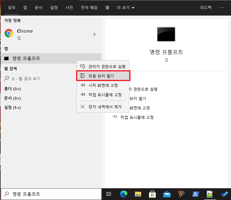 먼저, 윈도우키를 누르시고, CMD 키를 입력하셔서 명령 프롬프트를 검색하여 주시길 바랍니다. 그런 후에 [명령프롬프트] 아이콘에서 마우스 오른쪽 버튼을 클릭하여 주신 후 [파일 위치 열기]부분을 클릭하여 주시길 바랍니다.