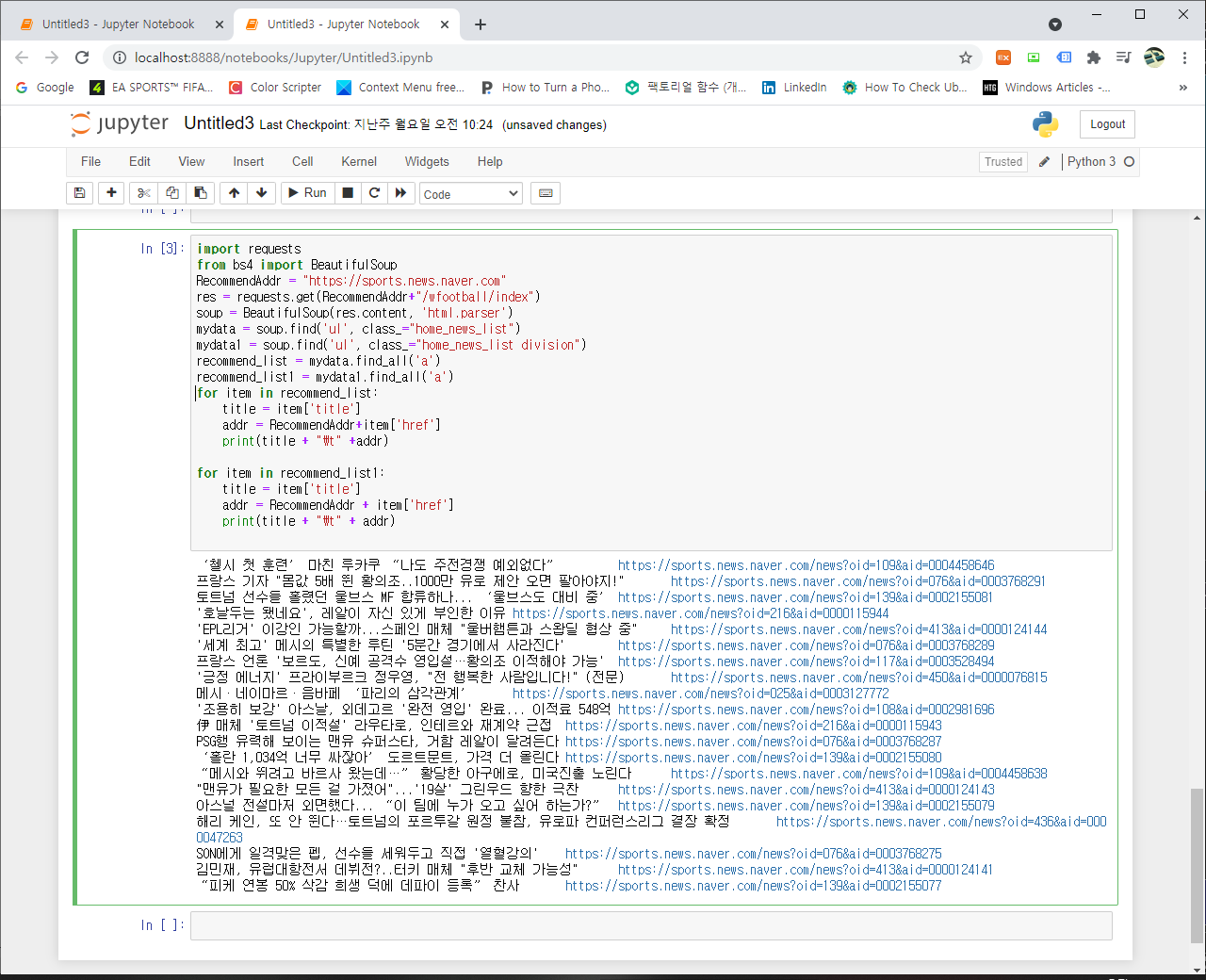 여기에서는 제목도 주소도 포함되고 있었습니다. 단, 주소의 경우는 앞에 다음과 같은 주소 https://sports.news.naver.com부분이 이 필요합니다. 그럼 럼 이 부분을 토대로 한번 파싱을 해봤습니다. 먼저 전체 코드를 살펴보겠습니다.