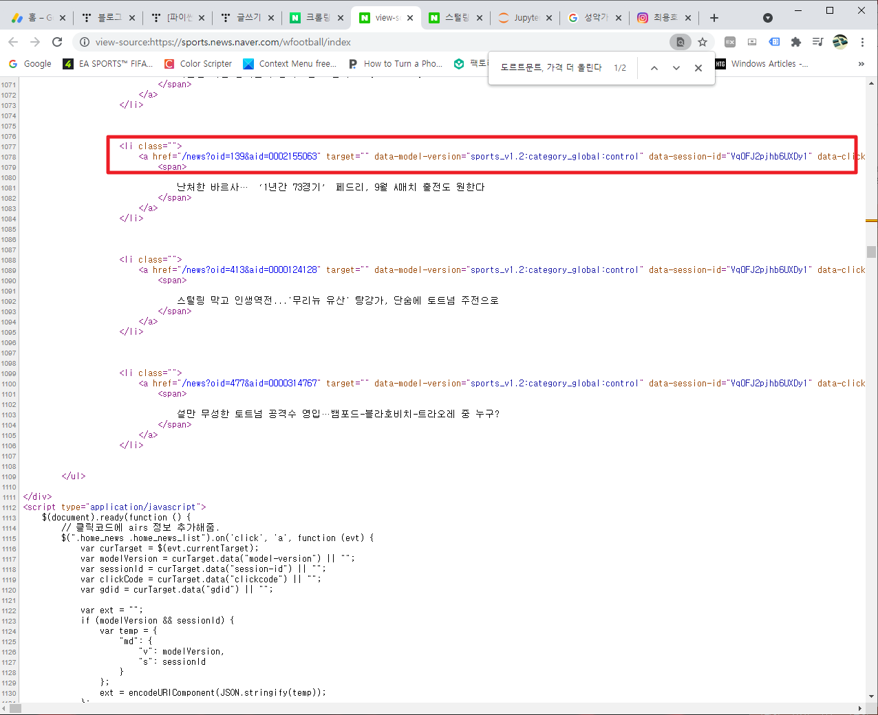 이전 포스팅에서는 추천뉴스의 제목을 추출하는 방법에 대해서 포스팅을 했습니다. 그 작업을 하고 포스팅을 하고 나니, 관련된 주소또한 추출해볼까라는 생각을 하였습니다. 그래서 다시 한번 코드 보기를 바탕으로 다음과 같은 화면을 봤습니다.