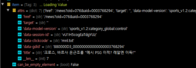 a라는 태그를 받아오니, 각 항목들이 Dictionary형태로 값을 받아 왔습니다.