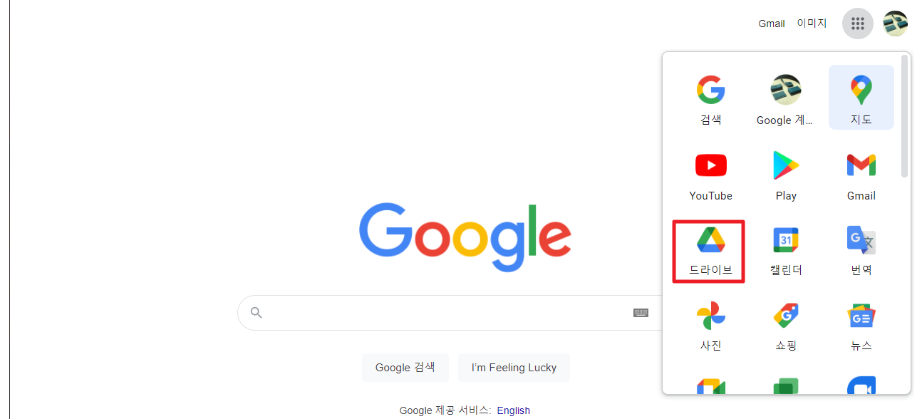 먼저, 크롬등의 브라우저를 통해서 구글 드라이브를 실행시켜주시길 바랍니다. Chrome의 우측 상단에 보시면 더보기 부분을 클릭하시면 구글에 관련된 앱등이 나타납니다. 여기에서 [드라이브] 부분을 클릭하여 주시길 바랍니다.