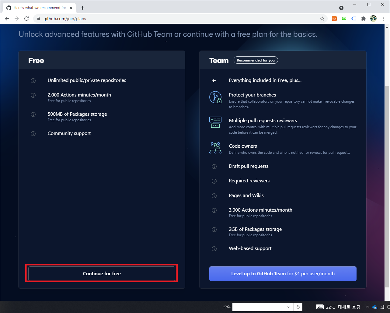 그런 후에 이 부분을 무료 버전을 사용할 것인지, 아니면 유료 버전을 사용할 것인지에 대해서 선택할 수 있습니다. 저의 경우는 혼자 저의 코드를 저장 및 관리하기 위한 용도이므로, 무료 버전을 선택하였습니다.