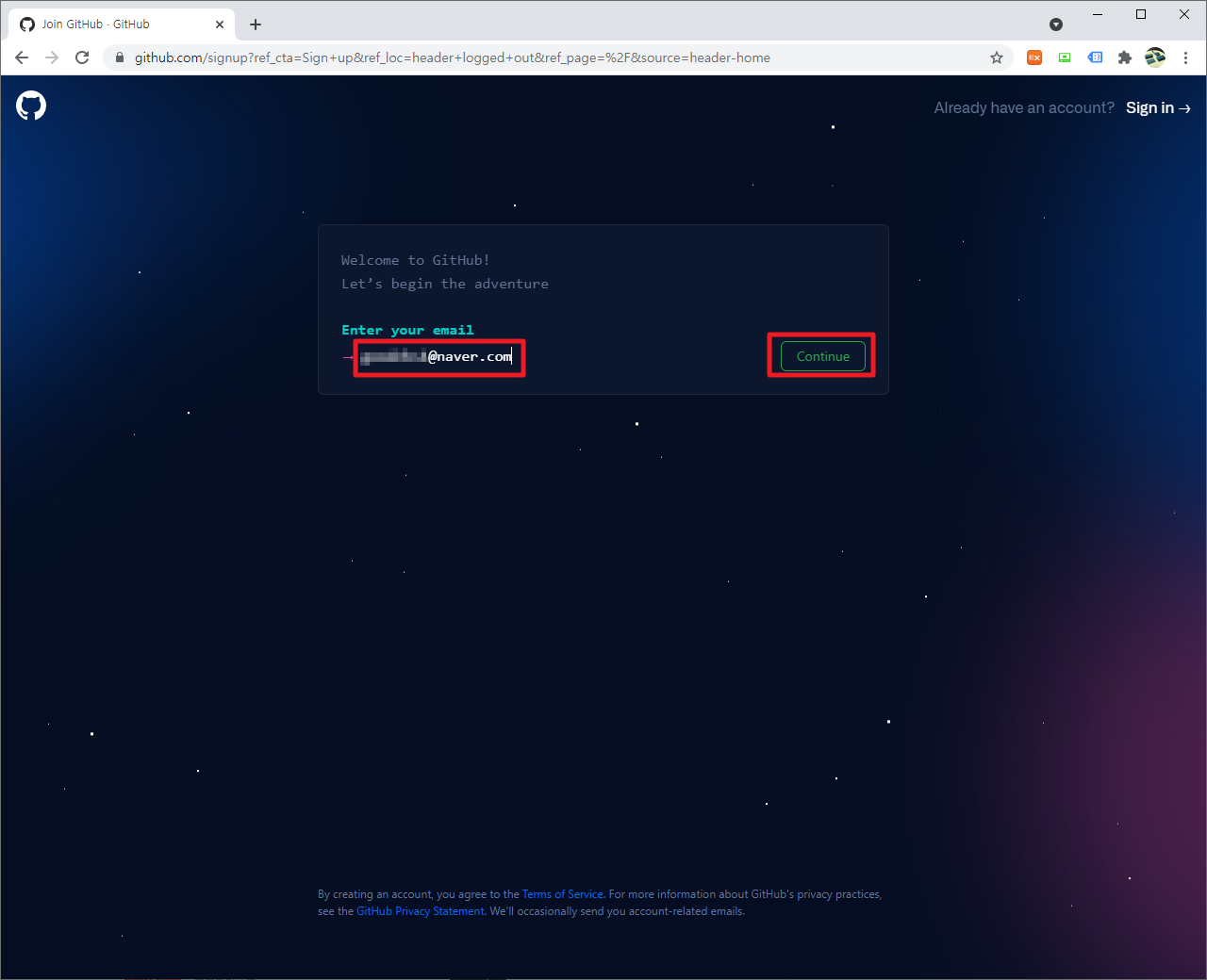 그럼 다음과 같이 이메일(e-mail)을 입력해야 하는 부분이 나타나고, 여기에서 이메일(e-mail)을 입력하고 [Continue]부분을 클릭하여 주시길 바랍니다.