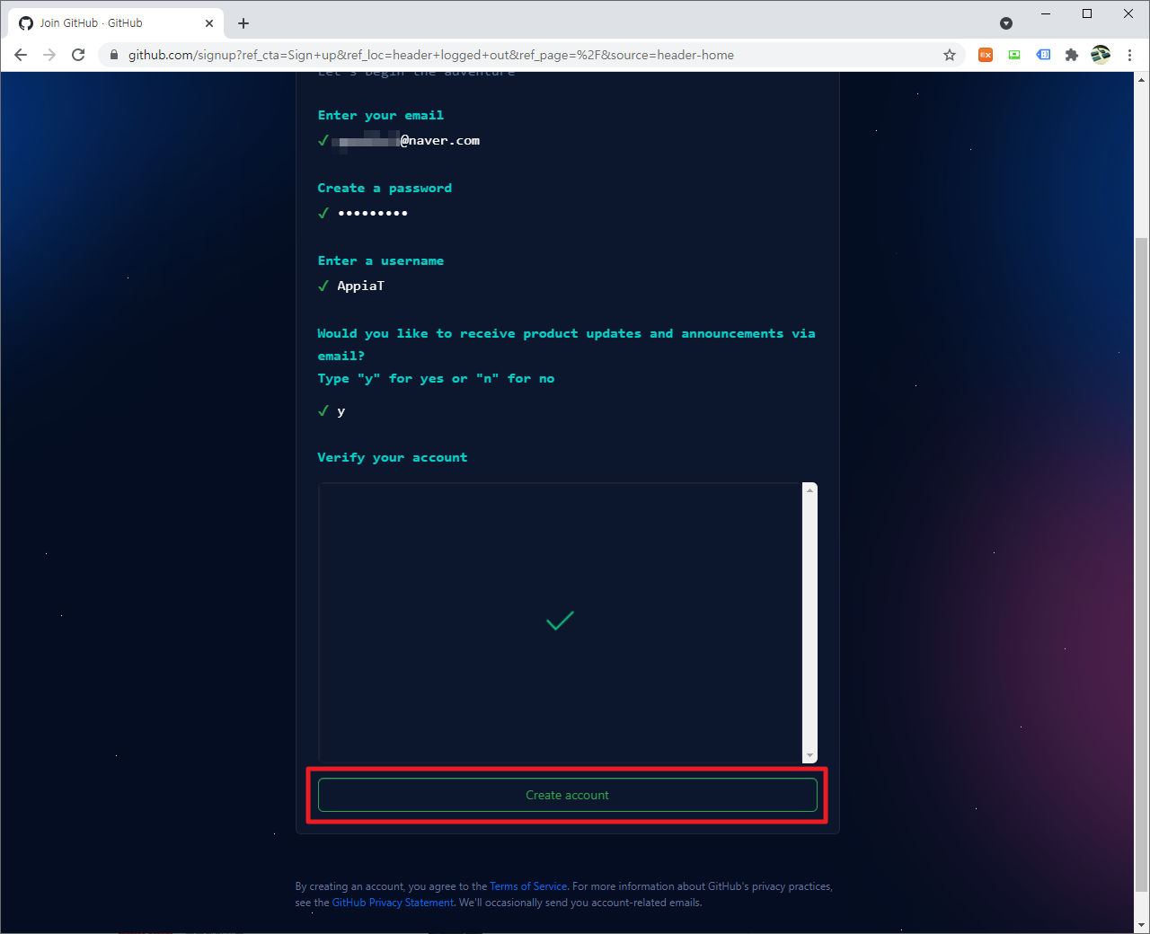 그런 후에 다른 외부 사이트들과 유사하게 사람이 가입한지에 대해서 확인하는 하고 나서, [Create account]부분을 클릭하여 주시길 바랍니다.