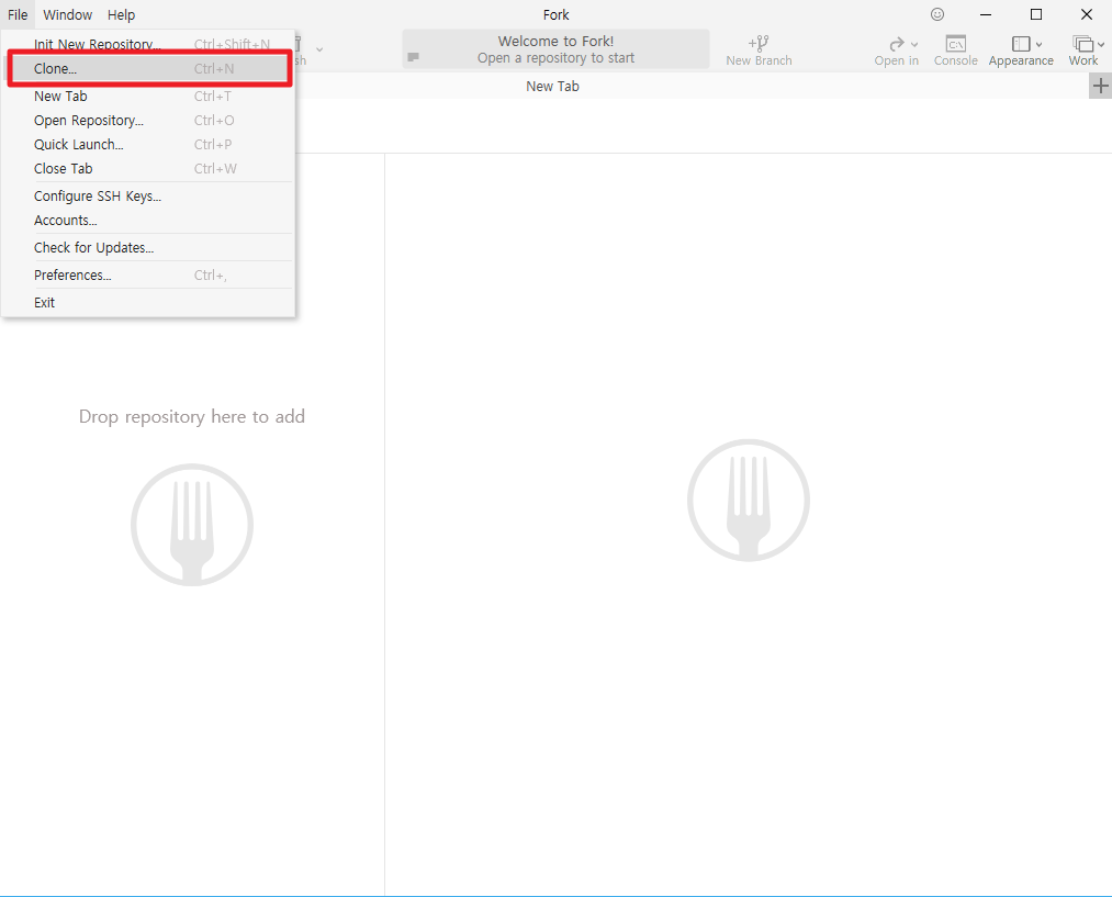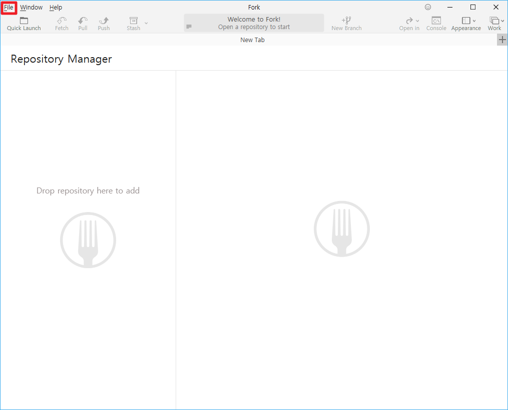 그럼 Fork가 설치되었다는 가정에서 Fork을 실행하여 주시길 바랍니다. 아마도 다음과 같은 화면으로 실행되실 것이라고 생각합니다. 여기에서 좌측 상단에 있느 [File]부분을 클릭하여 주시길 바랍니다.