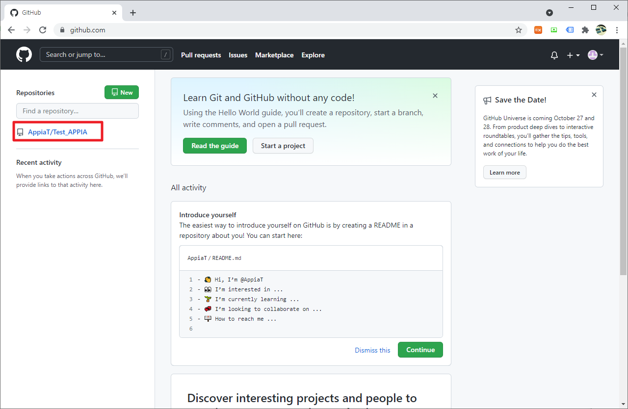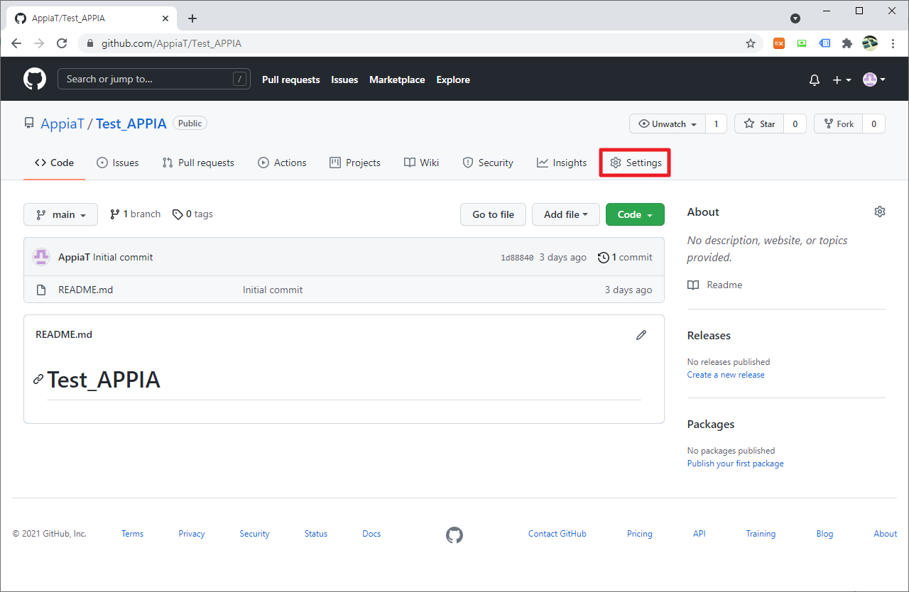 먼저, 현재 생성된 Repository를 클릭하여 주시길 바랍니다. 저의 경우 Test_APPIA라는 부분을 바탕으로 진행할 예정입니다.