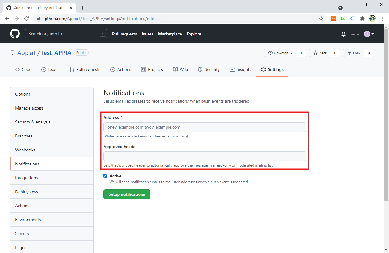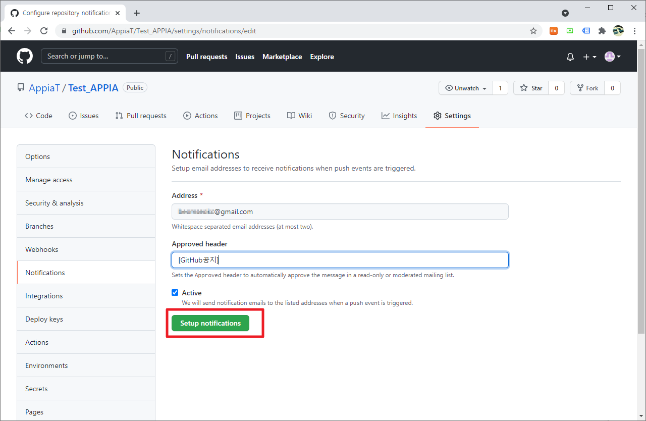 저의 경우 제가 가지고 있는 Gmail 주소를 입력하였습니다. 그런 후에 [Setup Notifications] 부분을 클릭하여 주시길 바랍니다.