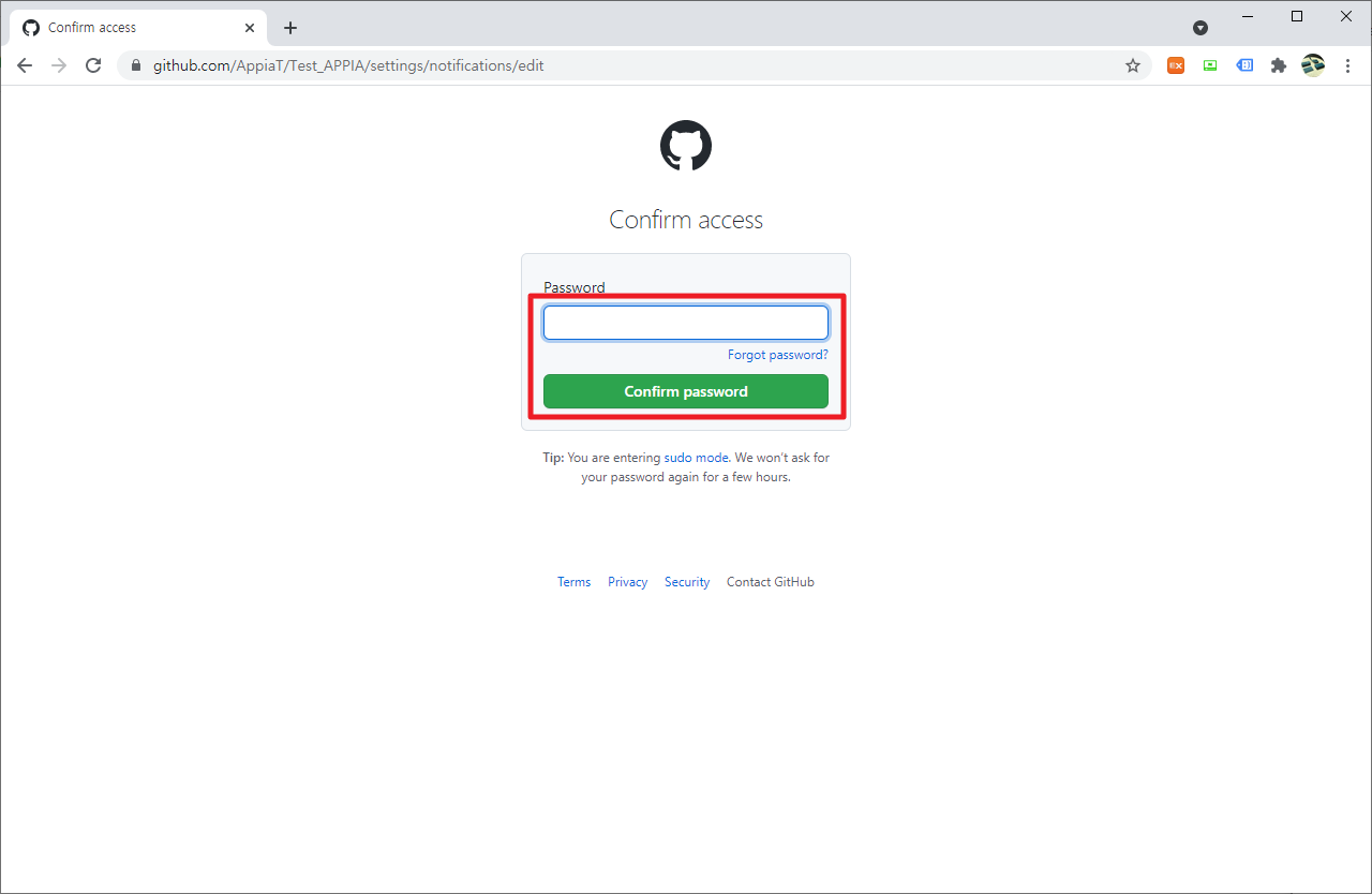다음과 같이 인증을 위해서 다시한번 비밀번호를 입력을 요청할 것입니다. 여기에서 비밀번호를 입력하여 주시길 바랍니다.