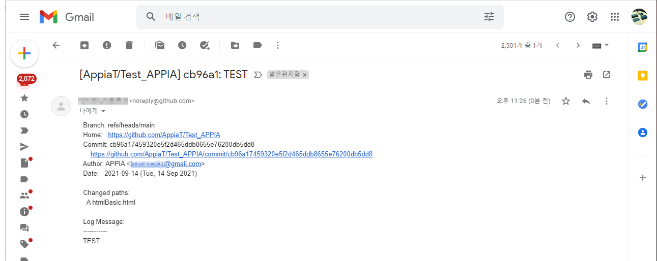 이 부분은 GitHub에 Push할 경우에 다음과 같이 Notification에 대한 알람 메일이 나타납니다.