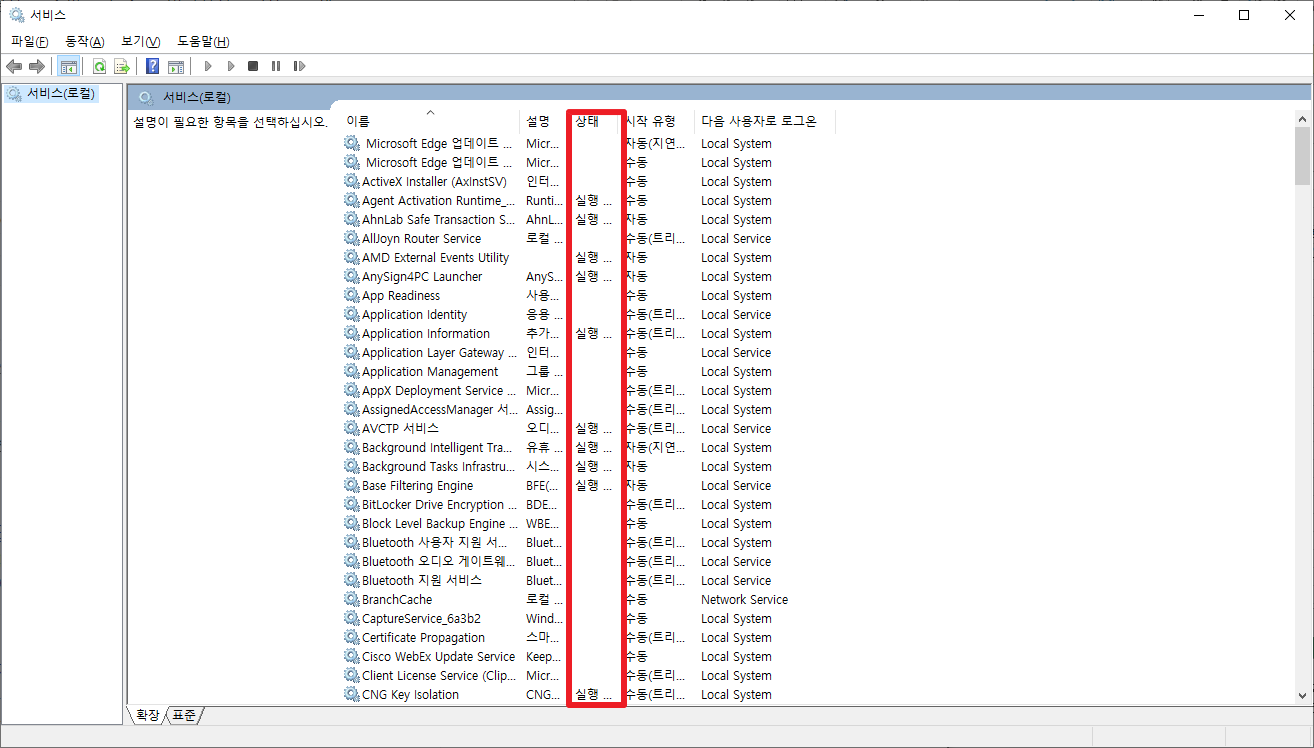 위에서 services.msc 실행하시면 다음과 같은 화면이 나타날 것입니다. 여기에서 화면에서와 같이 [상태]부분을 살펴보시면, [실행중,실행...]으로 표시가 된 부분을 볼 수 있습니다. 이 부분은 현재 백그라운드에서 실행되고 있는 부분을 나타내고 있습니다.