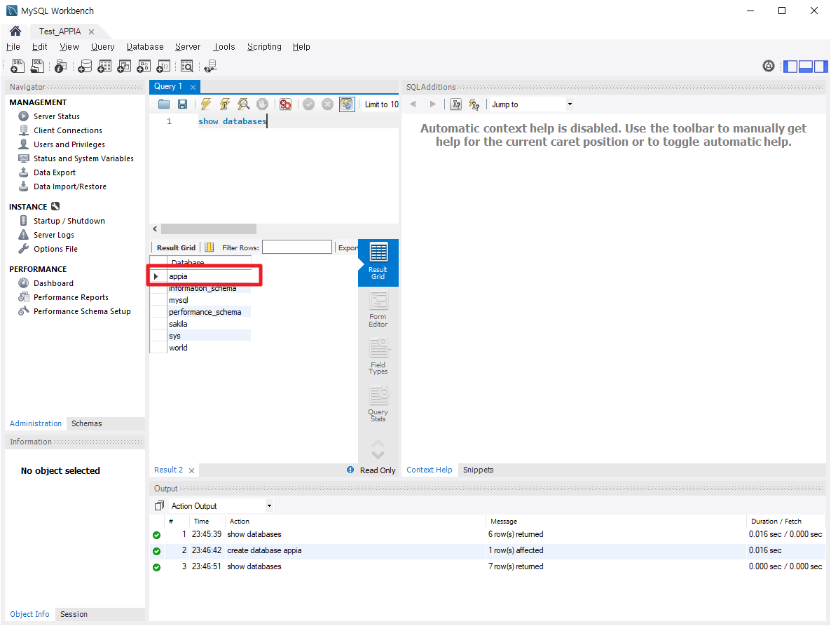 위에서 데이터 베이스(Database)를 확인하는 방법인 "show databases"를 이용하여 위에서 생성한 데이터 베이스(Database)를 확인해보도록 하겠습니다. 빨간색으로 보이는 부분과 같이 위에서 생성한 데이터 베이스(Database)인 appia가 존재하는 것을 확인하였습니다.