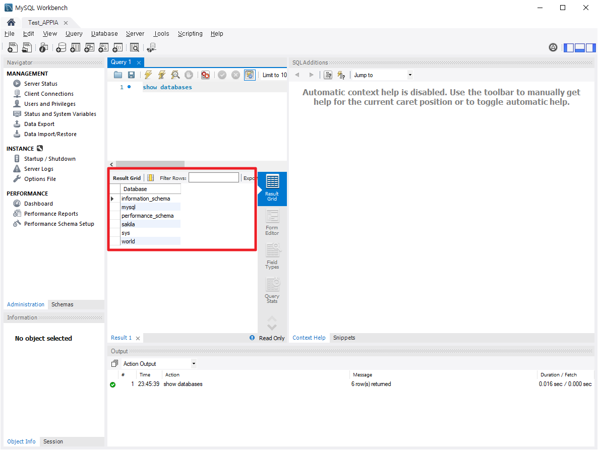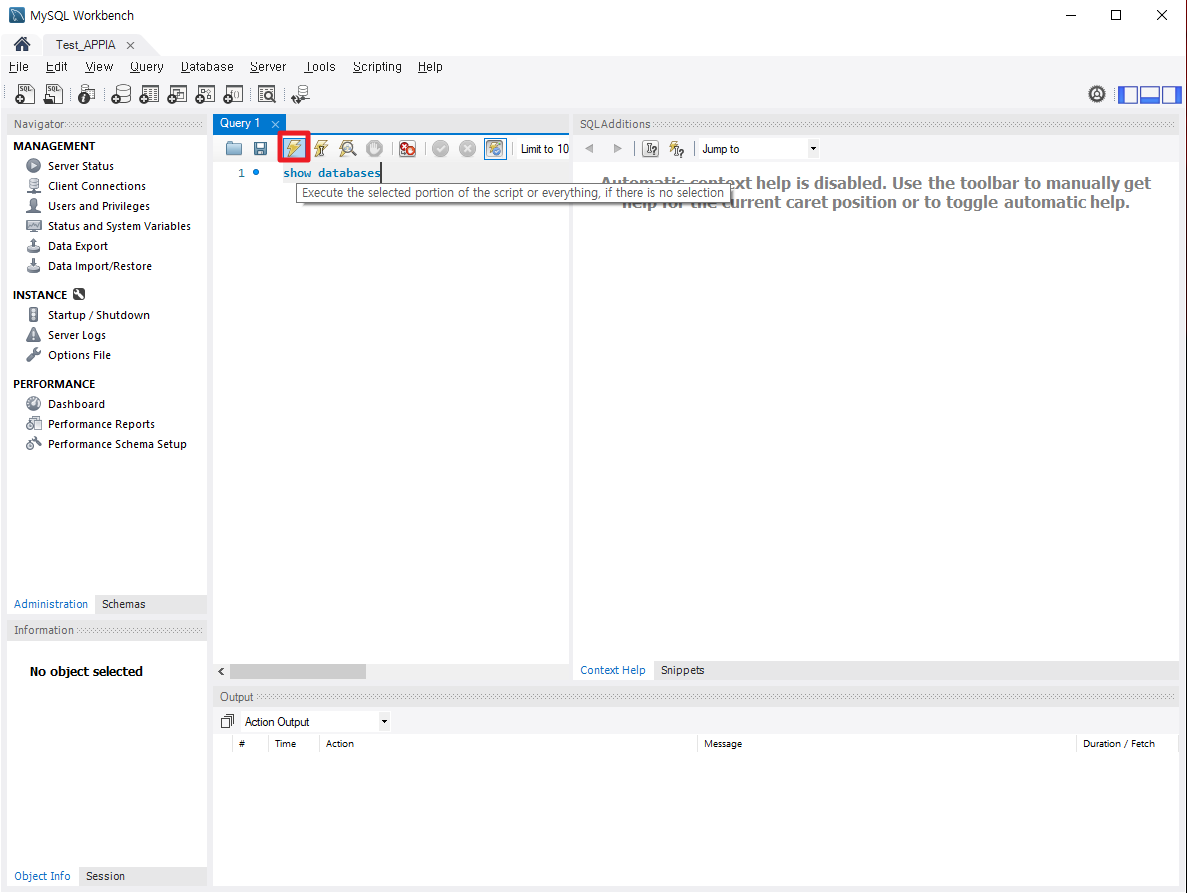 먼저, MySQL Workbench를 실행시키시면 다음과 같은 화면이 나타날 것입니다. 여기에서, 빨간 상자 표시가 있는 부분에 사용하시고자 하는 Commnad를 입력하시면 됩니다.