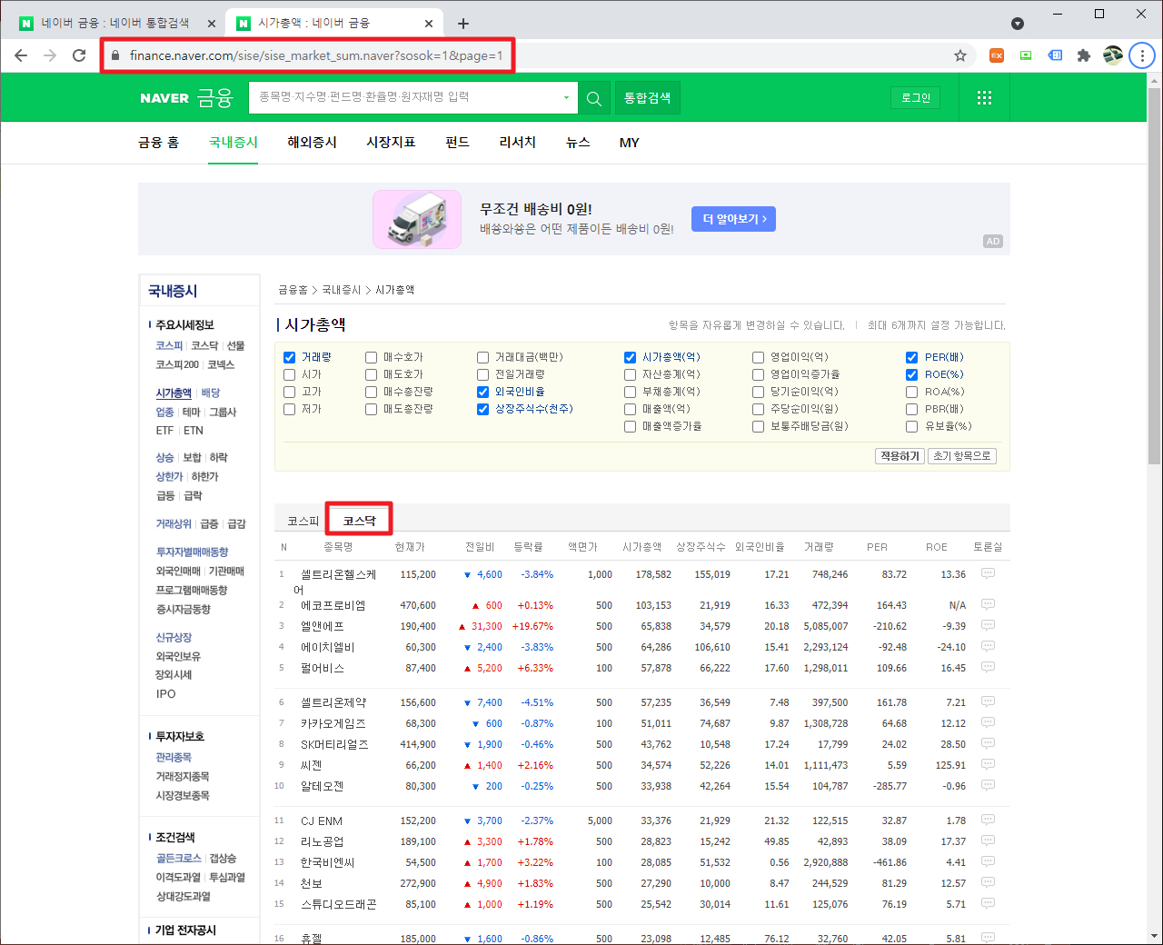 [파이썬 크롤링]네이버 주식 시가 총액 코스닥전체 항목 출력하기 본문