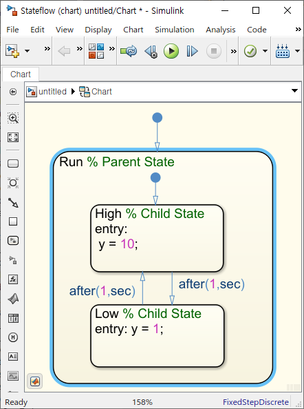 물론, 이 뿐 아니라 Subchart라는 개념도 존재합니다. 이 개념은 Simulink를 알고 있으신 분들에게 조금 더 쉬운 개념일 수 있습니다. Superstate와 크게 다르지 않지만 이 부분은 Simulink의 Subsystem이라고 생각하시면 됩니다. 즉 크게 다르지 않지만, 안의 내용에 대해서 숨겨 있다고 생각하시면 됩니다.