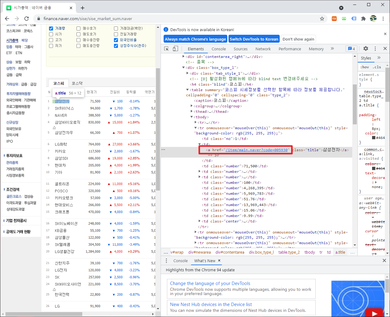 여기에서 개발자 모드를 통해서 다음 부분을 확인하도록 하겠습니다. 각 부분을 검토해보면, 종목 이름이 나타나는데에 다음과 같은 부분이 나타나는 것을 알 수 있습니다.