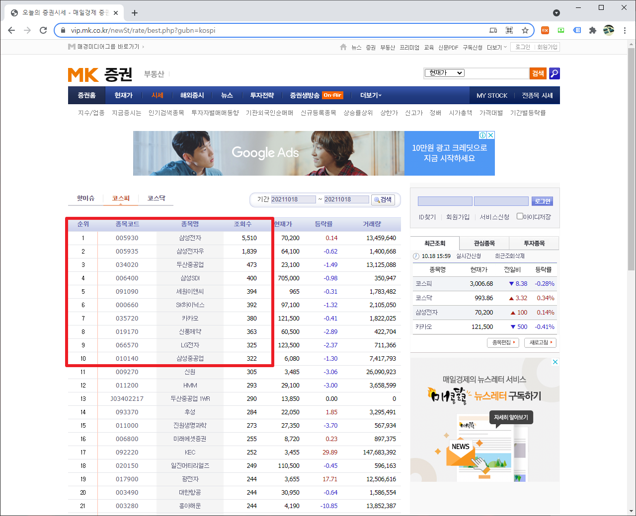 [파이썬 크롤링]매경, 매일경제 조회수 상위종목 출력하기